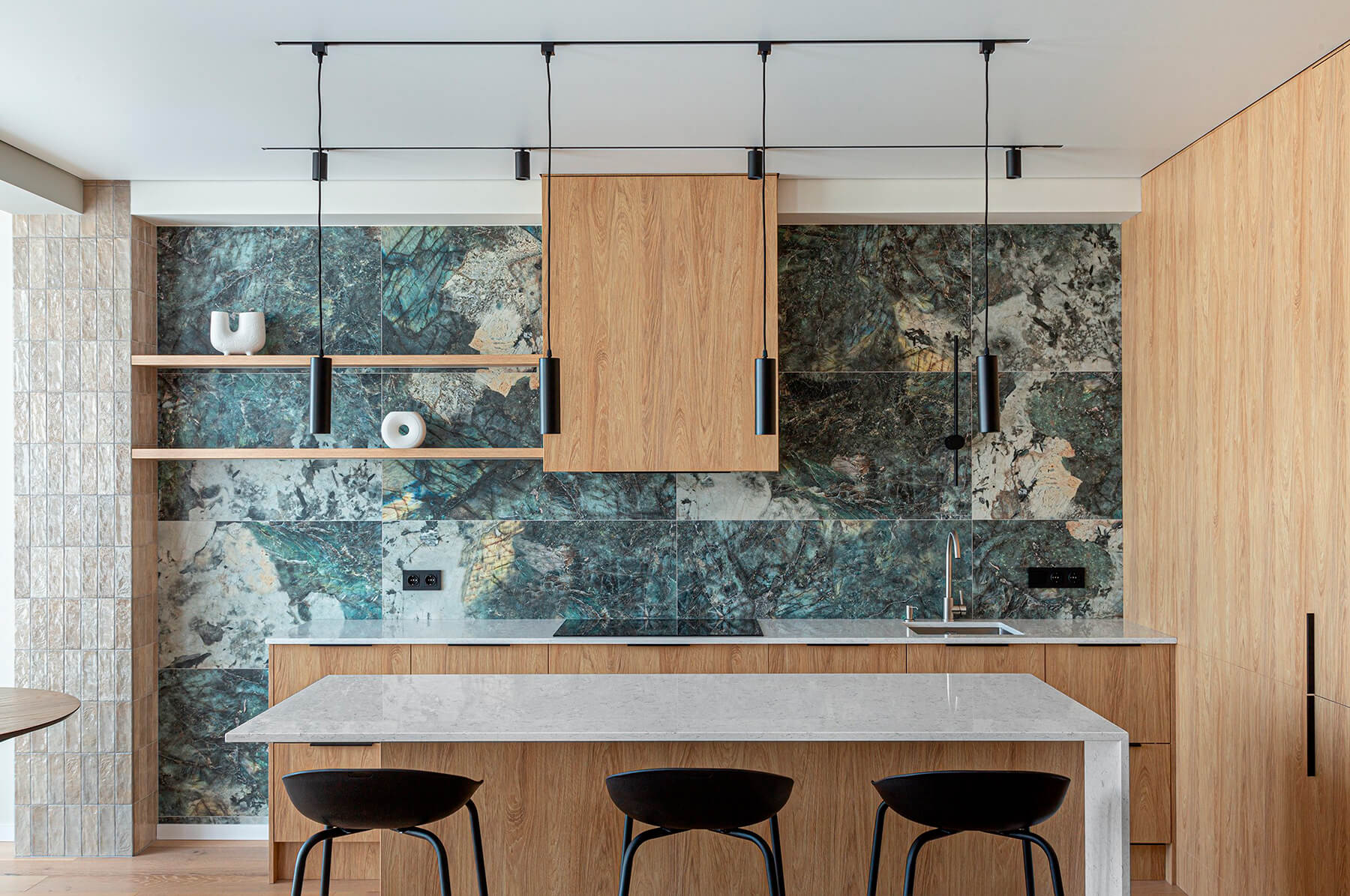 Фасады: ЛДСП Egger с текстурой дерева + МДФ крашеный матовый с 3D фрезеровкой